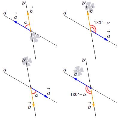 1. Допустим, что у нас есть прямая a с направляющим вектором a → = (a x , a y) и прямая b с направляющим вектором b → (b x , b y) . Теперь отложим два вектора a → и b → от точки пересечения. После этого мы увидим, что они будут располагаться каждый на своей прямой. Тогда у нас есть четыре варианта их взаимного расположения. См. иллюстрацию: